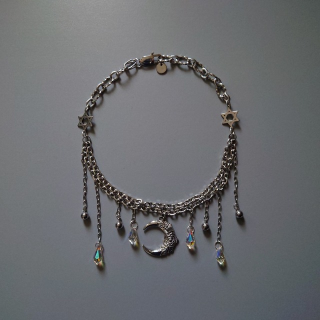 ⛧JiW JEWELRY 第陸作品群『眩暈』⛧ ⫘⫘2025.10.07 RELEASE⫘⫘ 星の降る夜をイメージした、「渾沌」ネックレスと対になる概念のアイテムです。 JiWのアイテムにしては珍しく繊細さも兼ね揃えていますので、ワンピースとかに合わせても良いかもです。 短めにしてチョーカーのようにしてもめちゃかわです。 金属部分はすべて、水やら錆やらいろいろにお強いステンレス製になっております。 ガラスチャームの偏光キラキラで気分も上がることでしょう。 ご希望の方には保管用の巾着袋をお付けいたします。(画像9枚目) 数に限りがございますので、なくなり次第終了となります。 ・全長 約38cm※留め具含む(サイズ調整可) ・重量 約29g ・材質 ガラス(クリアチャーム)     ステンレス(上記以外) ※本製品はすべてステンレス素材(クリアチャーム以外)を使用していますが、金属アレルギーが発症しないことを保証することはできかねます。 ※サイズには多少の誤差が生じる場合がございます。あらかじめご了承ください。 ご注文から発送まで、通常3〜5日ほどお時間をいただいております。 ハンドメイド商品ということにご留意いただき、丁寧にお取り扱いください。 材料入荷時からの小さい初期キズ等がある場合がございますが、ハンドメイドならではの魅力と経年劣化もお楽しみいただけますと幸いです。